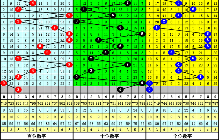 三、体彩排列三前9周星期三奖号分别开出:795-703-744-118-428-406-690-474-568,其中号码012路比为9:12:6,奇偶比为11:16,大小比为14:13;